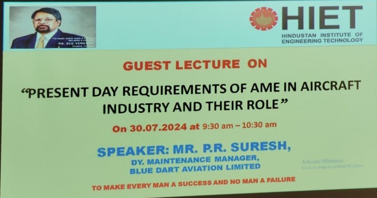 A Guest Lecture on “PRESENT DAY REQUIREMENTS OF AME IN AIRCRAFT INDUSTRY AND THEIR ROLE” delivered by Mr. P.R. Suresh, Dy. Maintenance Manager, Blue Dart Aviation Ltd at HIET Aviation College, Chennai on 30th July 2024. All the students of first year attended the program. He shared his complete aviation experiences and motivated our newly inducted students.